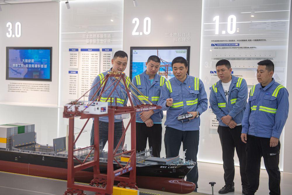 2022年5月24日,竺士杰(左三)在工作室利用模型向青年工人讲述桥吊操作原理。新华社记者 江汉 摄