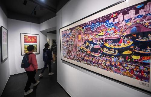 2022年11月22日,游客参观浙江省嘉兴油车港镇胜丰村菱珑湾农民画展馆。新华社记者 徐昱 摄