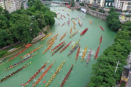 2019年6月5日,人们在贵州省铜仁市碧江区锦江河上参加龙舟巡游活动,迎接端午节的到来(无人机照片)。新华社发(伍卫东摄)