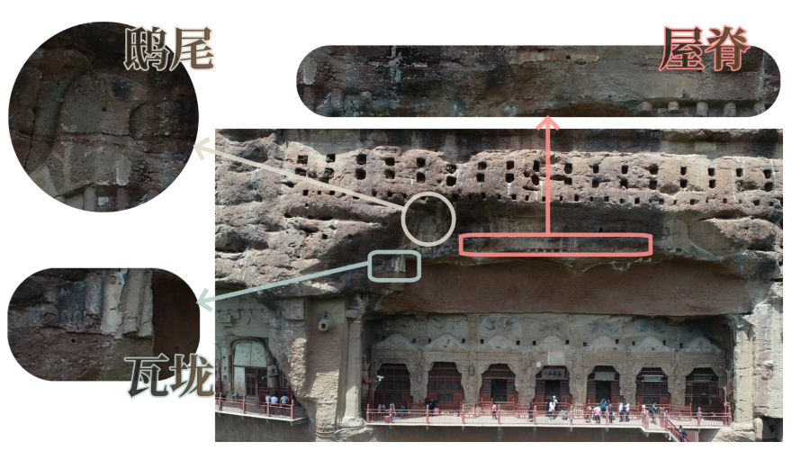 在山岩上凿出屋脊、鸱尾、瓦垅等