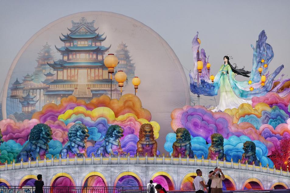 目光转向东北的哈尔滨,小长假期间,走进哈尔滨冰雪大世界,游客或许可以遇见化身“嫦娥”的巡游演员,与其对诗成功者还可免费获得一盏古风灯笼作为纪念。园区内特别设置的网红“打卡”点,成为市民游客竞相留影的热门地,每一张照片都定格了“冰城”独特的中秋韵味。