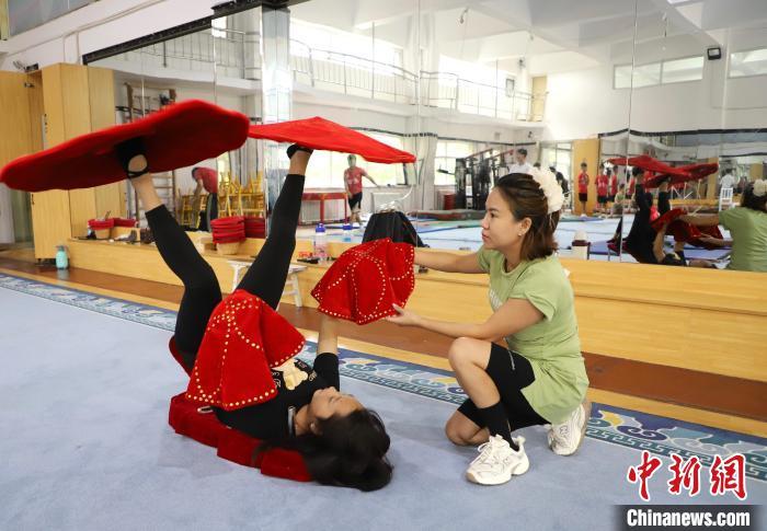 9月13日,来自老挝的红姆(右)指导学员杂技动作。 马天龙 摄