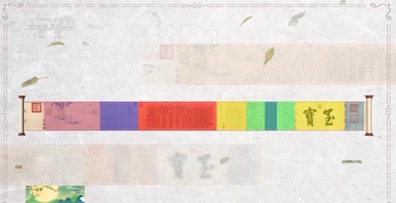 故宫博物院书画部研究馆员 王亦旻:这是中国特有的一种装潢形式,叫“三分创作,七分装裱”,通过装潢形式呈现出它最好的状态。中间这一块是核心的,它的两边是装饰性的隔水,再往外是两个副隔水,今天的这个样子,是清朝乾隆时期完成的装裱样式。