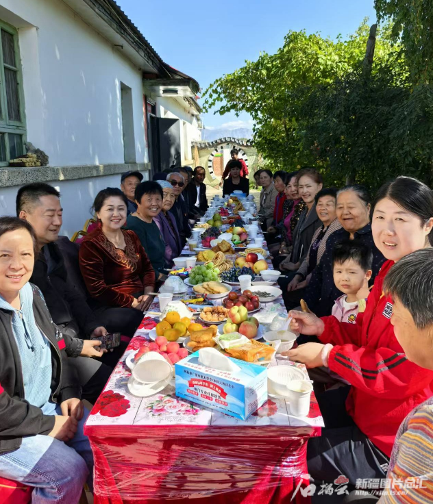 葡萄架旁,白桦树下,长条桌上月饼、馓子、奶疙瘩、果酱、葡萄、苹果摆得满满当当,奶茶的醇香扑鼻而来。红墩镇30多位居民坐在桌前,谈笑风生。大院女主人李红秀跑前跑后忙个不停。