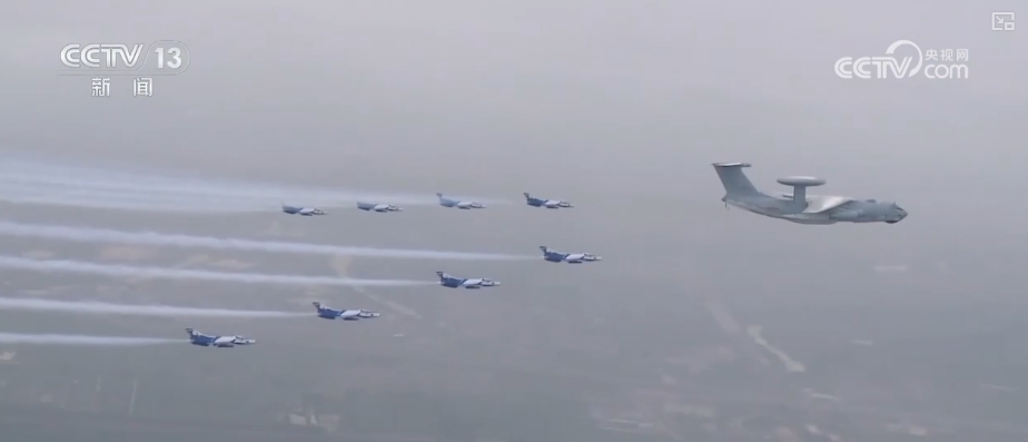 这是2009年10月1日,新中国成立60周年阅兵式上,机群飞过天安门广场的壮观场景。领航机型是我国自主研发的预警机空警2000和空警200,这也是中国预警机第一次在全球观众面前公开亮相。