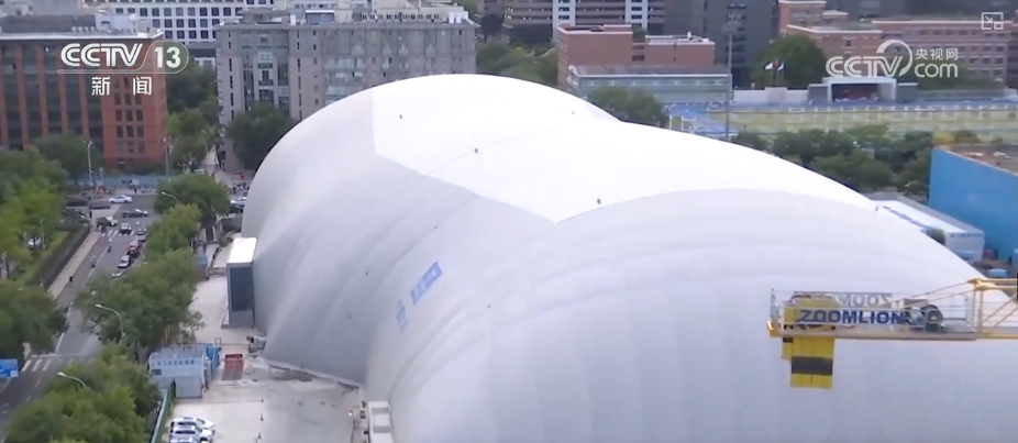这个“气球”的全名叫作基坑气膜,是由高强度聚酯纤维膜材制成的,它长144米、宽74米,占地面积相当于1.4个标准足球场大小。由于它将施工机械全部罩进了一个密闭的空间里,施工时产生的噪声就很难散发出去,这样就大大降低了对周边环境的影响。