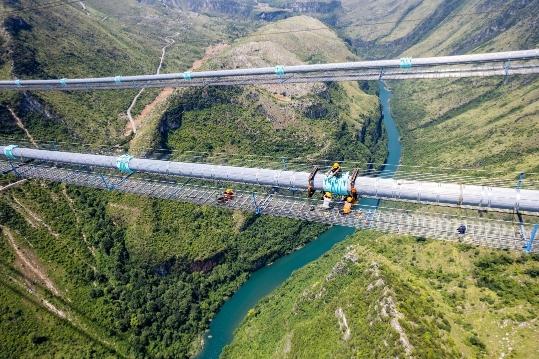 花江峡谷大桥主桥跨径1420米,桥面到水面的高度达625米。目前,大桥已完成主缆索股架设,正有序进行索夹吊索安装及钢桁梁组装施工,总体进度达70%。建成后,花江峡谷大桥不仅主桥跨径居山区桥梁跨径世界第一,也将成为新的山区峡谷世界第一高桥。