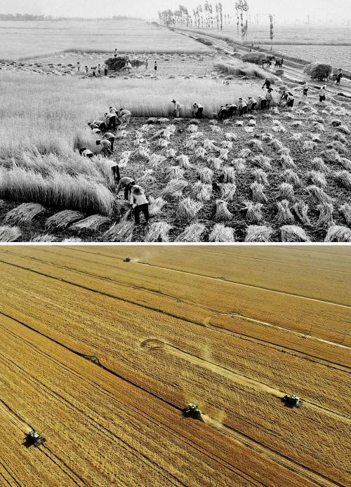 拼版照片:上图为20世纪50年代,河南偃师万亩丰产区开镰收割小麦(新华社记者 唐茂林 摄);下图为2021年6月6日,在河南周口黄泛区农场九分场的麦田里,农机手操作收割机收获小麦(新华社记者 李安 摄)。