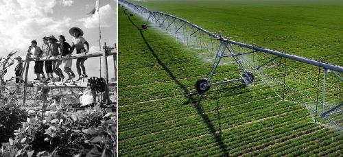 拼版照片:左图为20世纪50年代,河南郾城万金公社社员在踩水车浇田(魏德忠 摄);右图为2017年3月9日,在河南浚县王庄镇一处麦田里,自走式智能喷灌机在进行喷灌作业(新华社记者 李安 摄)。