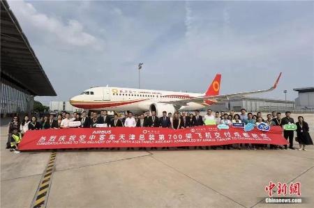 7月8日,由空中客车天津A320系列飞机亚洲总装线完成总装的第700架飞机顺利交付。图为交付仪式。中新社记者 佟郁 摄