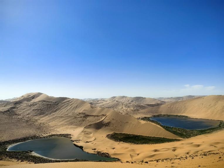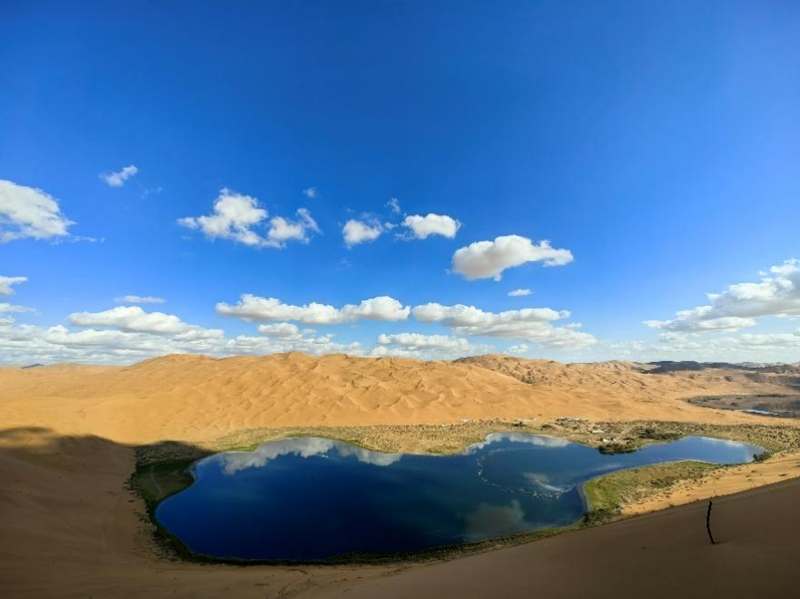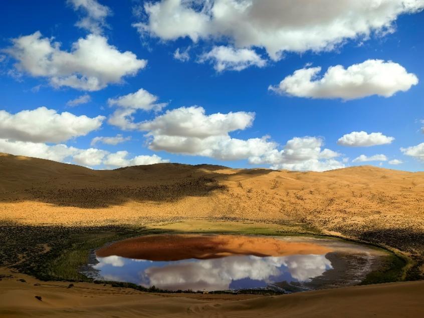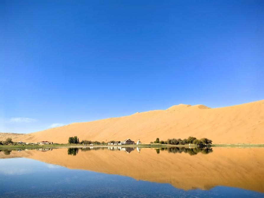 苏敏吉林是巴丹吉林沙漠高大沙山区人类活动的中心,沙山、古刹、碧草倒映苏敏吉林湖中,宛若幽静的世外桃源。