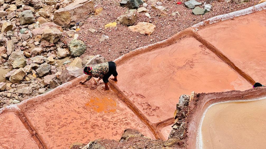 当前是盐田修补季。盐田底部涂有一种红土,卤水在田上蒸发,并部分下渗形成盐柱。红土须每年更换,否则卤水会全部下渗,颗粒无收。