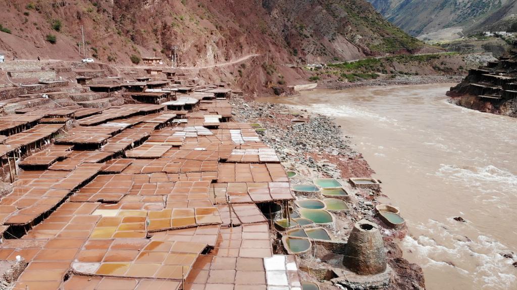一块块盐田横连纵叠。在矿物质和微生物作用下,盐卤呈现不同颜色,仿佛山坡上的“调色盘”。