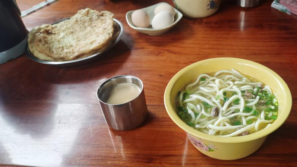 藏面的经典套餐中还包括牛肉油饼、鸡蛋和甜茶。新华社记者魏冠宇 摄
