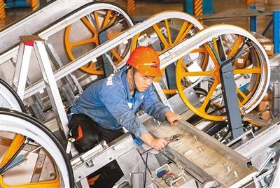 近日,在位于浙江省宁波市鄞州区东吴镇的宁波宏大电梯有限公司,工人在全自动化电梯生产线上赶制出口秘鲁、印度尼西亚等国的电梯产品。胡学军摄(人民视觉)