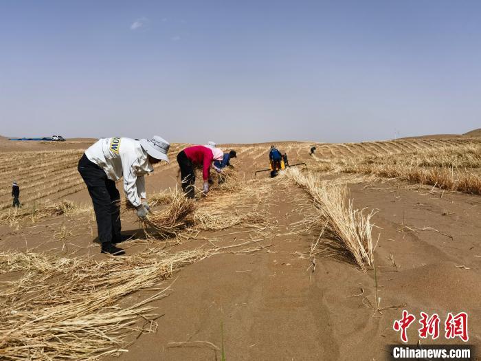 2024年6月,河西走廊—塔克拉玛干沙漠边缘阻击战工程固沙现场。(阿拉善右旗宣传部供图)