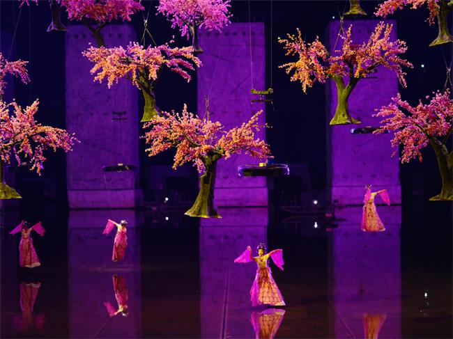 第一幕桃园结义伊始,梦幻的桃花林便从天而降,瞬间将观众带入到历史中的那片桃园。而后,在身陷曹营、水淹七军等剧目中,现场演员又如同神兵一般驰骋在空中,用利落又不失力量的动作,掀起一阵阵赞叹声。