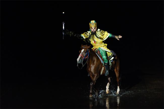水上烽烟惊乍,再现关公叱咤。刀身在灯光的照耀下闪烁着寒光,这位魁梧的男子单手挥舞长刀,俨然武圣模样,仿佛真正的关羽穿越千年时光,站在观众的眼前。
