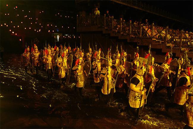 尤其是在火烧赤壁的一幕中,整个剧场都被火焰所笼罩。古朴的城墙下,火把摇曳,映照出战士们坚毅的面庞。石像柱体凭借自带的喷水、喷雾和灯光系统,渲染出雾气迷蒙的氛围,将士们的身影在雾气中若隐若现,只留下冲锋的口号声,在场观众的情绪也被推向顶点,随剧情的发展而紧张起来。