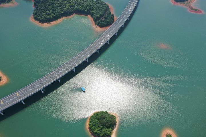 这是位于江西省九江市永修县与武宁县交界处的庐山西海与跨过水面的永武高速公路(无人机照片,2024年6月7日摄)。 新华社记者 周密 摄
