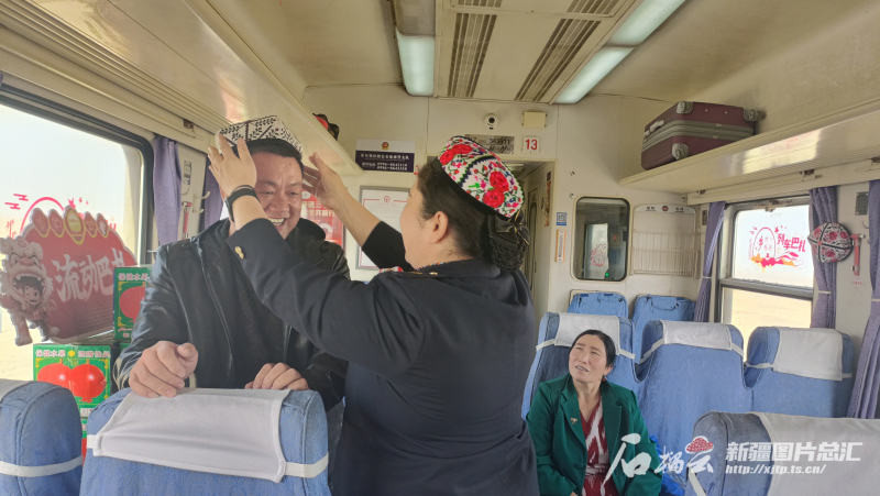 9月23日,7558次列车巴扎上,列车员玛依然·赛买提给来新疆旅游的乘客戴上了一顶小花帽。石榴云/新疆日报记者 宋卫国摄