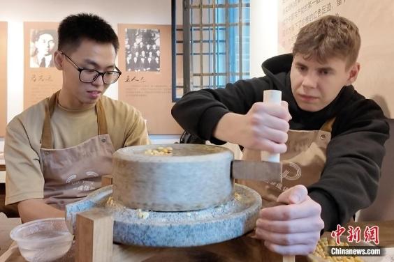 “洋弟子”体验豆腐制作。 张子怡 摄