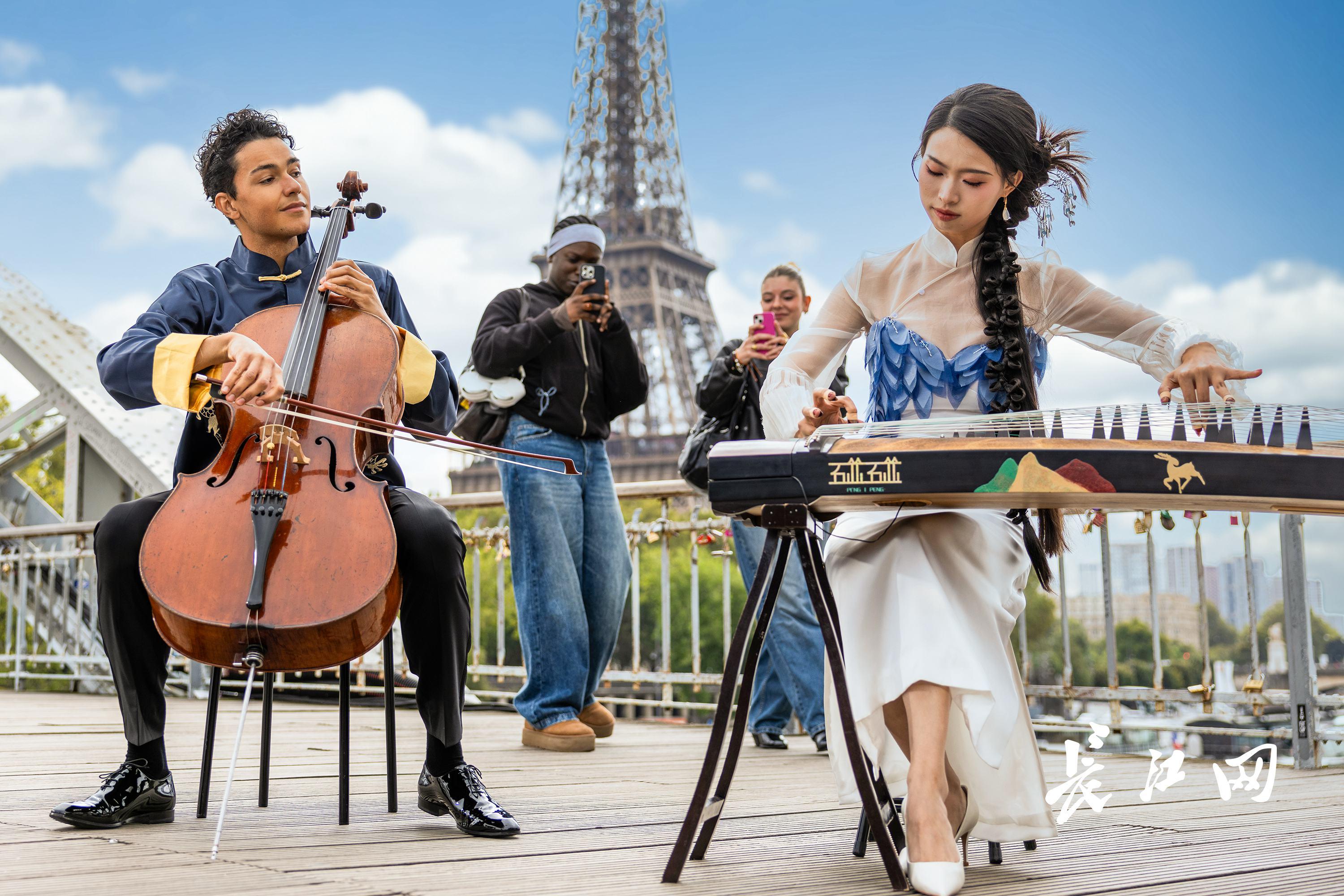 《长江遇见塞纳河》快闪现场,瑞士大提琴家本杰明-雅各布斯与旅法古筝演奏家彭静旋(碰碰彭碰彭)合奏音乐。长江日报记者贾代腾飞 摄