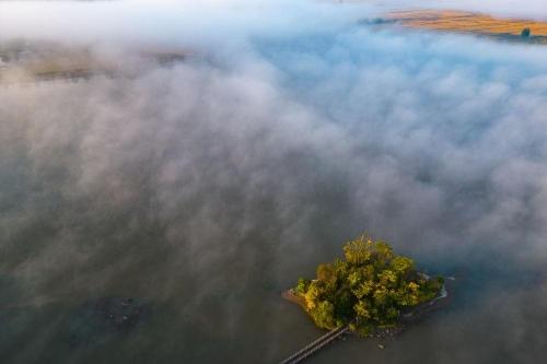 9月26日,为晨雾笼罩的玄武湖若隐若现(无人机照片)。新华社记者 张涛 摄