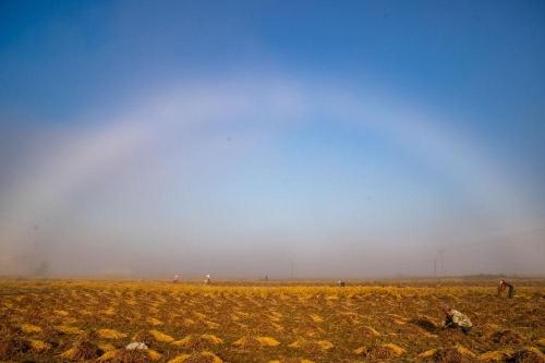 9月26日,在上官地村的稻田地里,村民在晨雾中收割水稻。新华社记者 张涛 摄