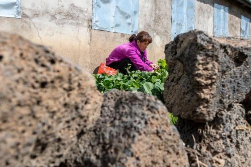9月25日,在上官地村,村民张丽君在用火山岩石围起来的院子里摘菜。新华社记者 张涛 摄