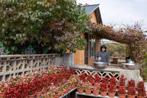 9月25日,在上官地村,村民薛艳新正在接水浇花。新华社记者 张涛 摄
