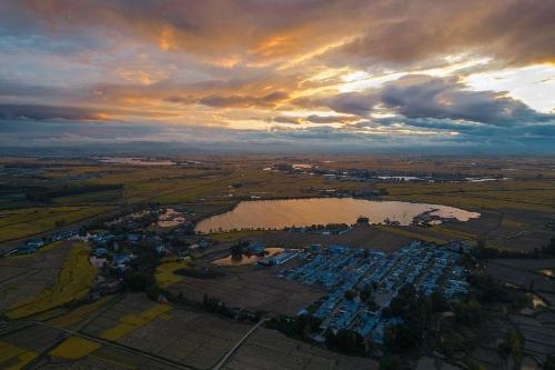 9月26日,金黄色的稻田与上官地村相融合(无人机照片)。新华社记者 张涛 摄
