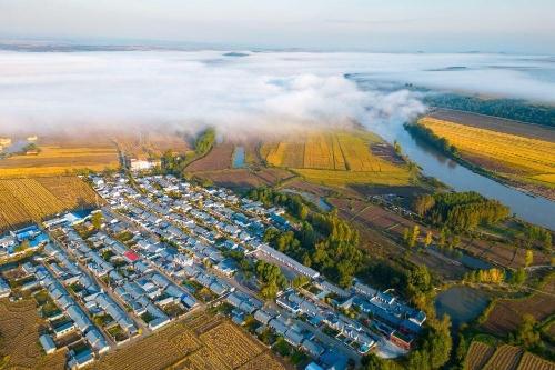 9月26日,晨雾笼罩下的上官地村村景(无人机照片)。新华社记者 张涛 摄