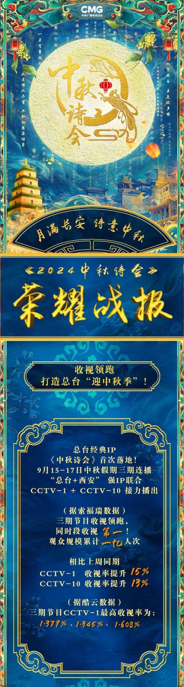 月满长安,诗意中秋。伴随着“总台+西安” 强IP联合 、CCTV-1 +CCTV-10 接力播出,《2024中秋诗会》热度持续不减。近日,中央广播电视总台发布收视数据,9月15至17日中秋假期三期节目收视同时段收视第一(据索福瑞数据),观众规模累计一亿人次。相比上周同期CCTV-1,收视率提升15%,CCTV-10 收视率提升 13%(据酷云数据),三期节目CCTV-1最高收视率为: 1.379%、1.345%、1.608%。