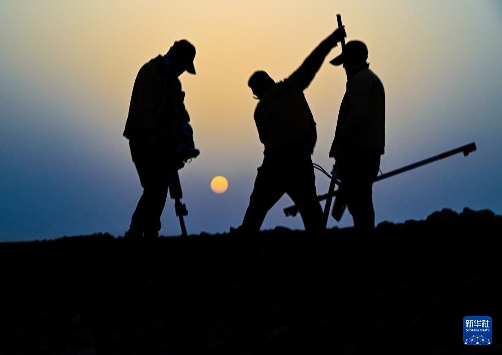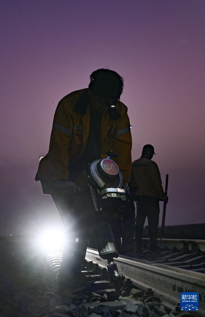 戈壁上,威克镐撞击道砟发出的声音同工人们做伴。太阳升起后,职工工作服上已落上了灰尘。