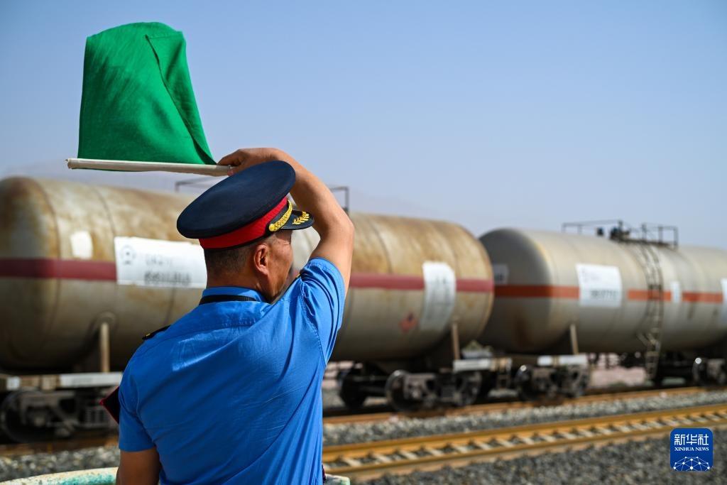 在西格尔车站,车站值班员王春海在站台上用旗语指挥过站车辆(9月25日摄)。新华社记者 靳博文 摄