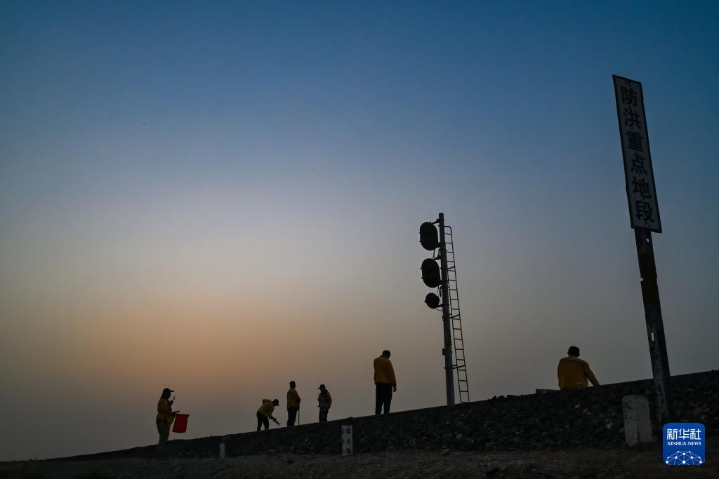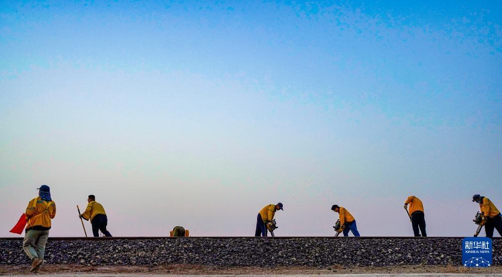 清晨,在五间房车站附近,喀什基础设施段西格尔综合维修车间职工在铁道上进行维保作业(9月26日摄)。新华社记者 靳博文 摄