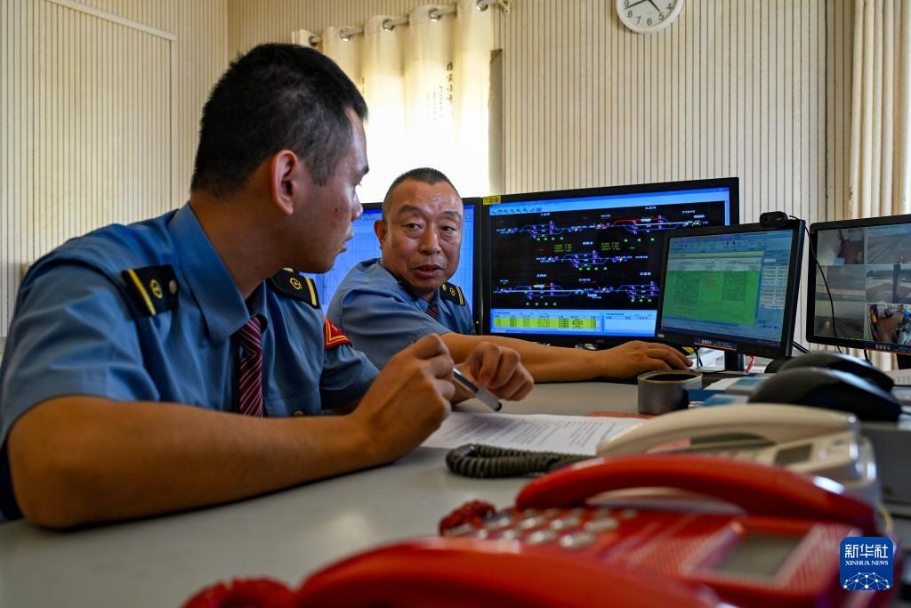 在西格尔车站行车室,车站值班员王春海(左)在指导徒弟白雅楠(右)工作(9月25日摄)。新华社记者 靳博文 摄
