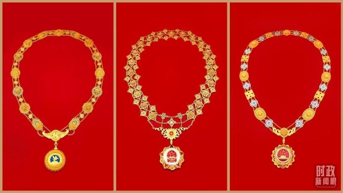 △“共和国勋章”(中)、“友谊勋章”(左)和国家荣誉称号奖章(右)。(总台央视记者郭鸿、鄂介甫拍摄)