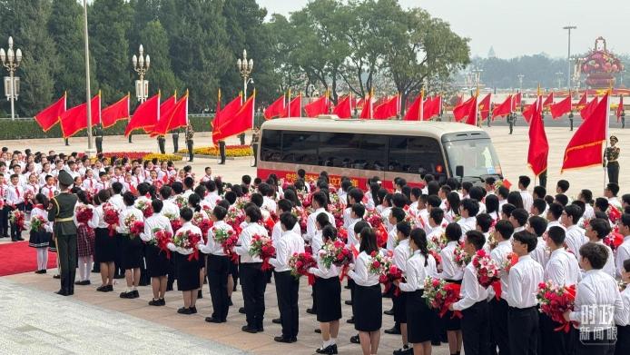 △2024年9月29日,人民大会堂外,少先队员列队迎接英雄模范。(总台央视记者蒋硕拍摄)