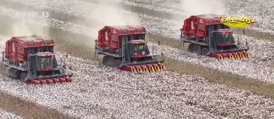 在昌吉州玛纳斯县乐土驿镇的万亩棉田里,新引进的棉花采收打包一体机正在棉田里穿梭。