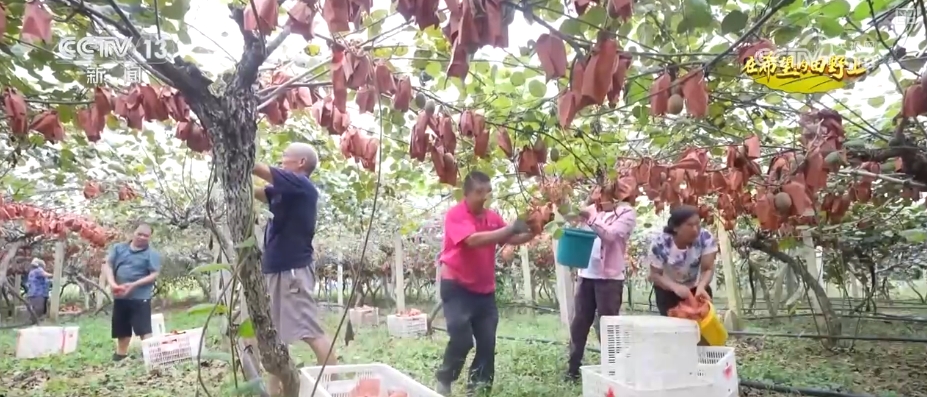 这是南阳市西峡县的一处果园,翠绿的枝叶间挂满了毛茸茸的猕猴桃,空气中飘荡着清甜的果香。果农们熟练地挑选、采摘,一掐一攥,一个个色泽鲜亮的猕猴桃就装入桶内。