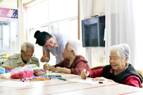 2024年5月25日,在山东省日照市东港区石臼街道日照幸福护理院,老人在工作人员的陪护下做填图游戏。新华社记者 郭绪雷 摄