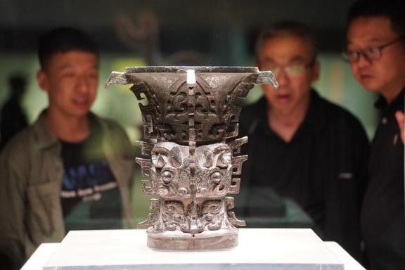 2024年5月9日,在陕西省宝鸡市,游客在宝鸡青铜器博物院内参观西周文物何尊。新华社记者 邵瑞 摄