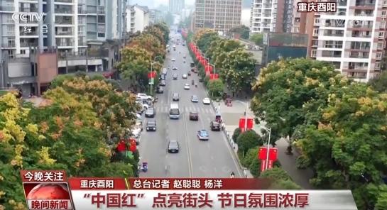 重庆酉阳土家族苗族自治县街头装扮一新,处处洋溢着喜庆的节日氛围。在酉阳城区桃花源大道北路,街头处处装点“中国红”。