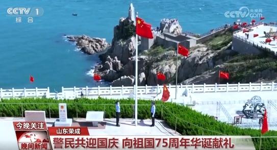 在中国最早看见海上日出的地方——山东荣成成山头,10月1日上午9时整,驻守在这里的海岸民警举行了一场庄严而又温馨的升旗仪式。随着国歌响起,海岸民警和游客们一起向国旗敬礼,表达对伟大祖国的美好祝愿。