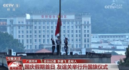 10月1日上午,广西凭祥友谊关城楼举行升国旗仪式,英姿飒爽的国旗护卫队步伐整齐地护卫着国旗入场,人们深情祝福祖国繁荣昌盛,礼赞伟大时代。
