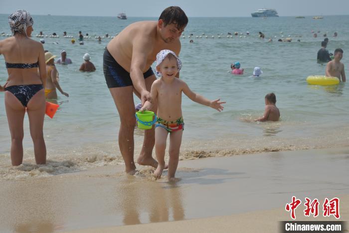 10月2日,海南三亚大东海旅游区沙滩上游人如织。图为外国亲子家庭在三亚玩海。张月和 摄