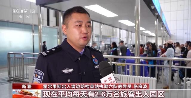 霍尔果斯出入境边防检查站执勤六队教导员 张良波:现在平均每天有2.6万名旅客出入园区,为最大限度保障旅客高效快速通关,我们采取错时通关模式。我们也会根据旅客的流量情况,动态调整我们的人工查验通道,最高可以加开到12条。