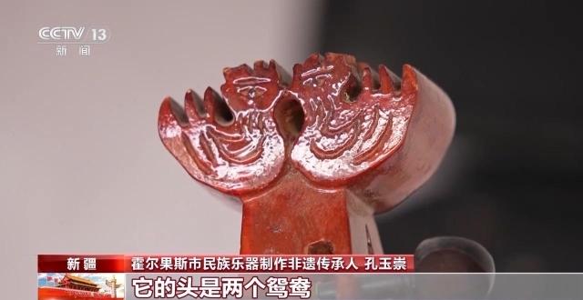 霍尔果斯市民族乐器制作非遗传承人 孔玉崇:鸳鸯是很美好的,它有两个腹板,也可以互为背板。它的头是两个鸳鸯,在一个腿上可以弹,坐着也可以拉,很方便。你带着这么一把琴就等于带了两把琴,因为它拉的也有,弹的也有。